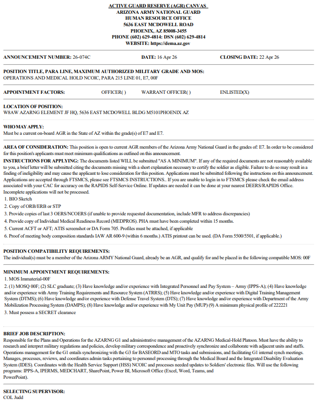 The Arizona Army National Guard (AZARNG) continuously provides a trained and ready force capable of performing unified land operations and defense support to civil authorities.